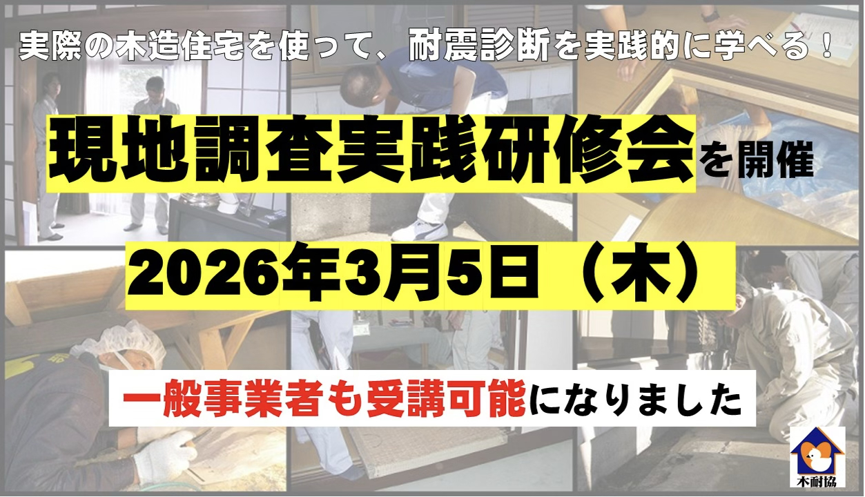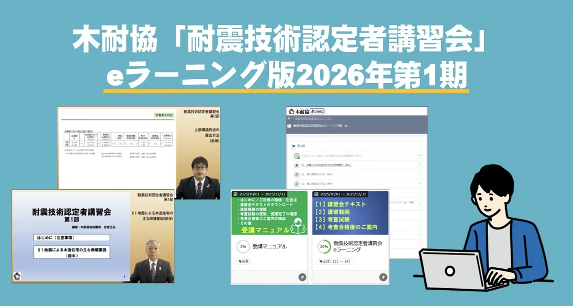 内容:改耐震技術認定者講習会の e-ラーニング版です。期間内であれば時間と場所を選ばず好きなタイミングで講義を受けることができます。⽊造住宅の耐震診断の基礎知識を習得できます。組合発⾜から28年で蓄積された耐震診断・補強のノウハウをお伝えします。安⼼・安全な家づくりを⾏う建築事業者の⽅には特に受講をお薦めいたします。